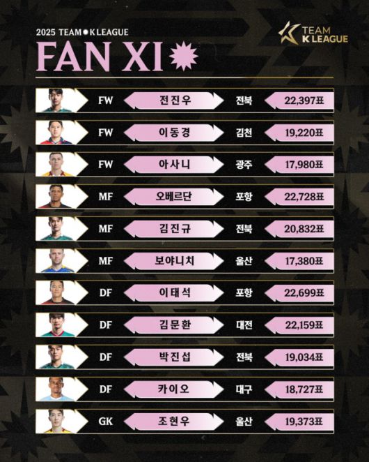 공격수(FW) 부문에서는 K리그1 득점 선두 전진우(전북, 22,397표)와 함께 이동경(김천, 19,220표), 아사니(광주, 17,980표)가 선발됐다.