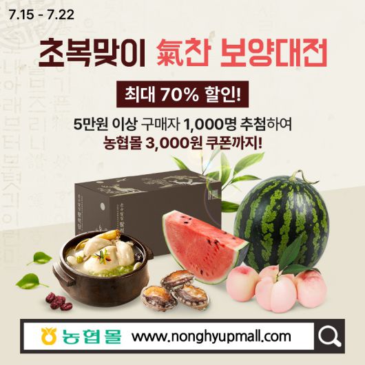 농협(회장 강호동) 경제지주(농업경제대표이사 박서홍)는 15일부터 8일간 농협몰(www.nonghyupmall.com)에서 ’초복맞이 기(氣)찬 보양대전’을 진행한다.