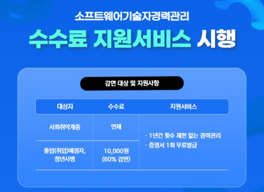 취업예정자(소프트웨어관련학과 졸업예정자 또는 졸업 후 3년 이내 미취업자)와 청년 사병(일반사병 또는 전역 후 3년 이내 미취업자)은 수수료의 60%를 지원받는다.