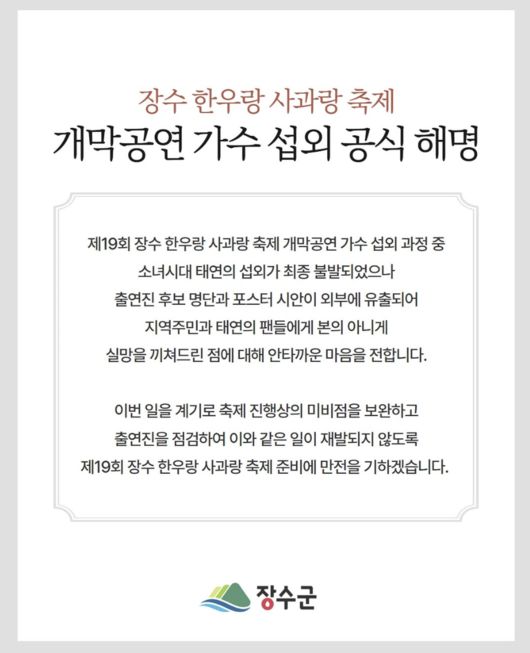 15일 장수군 측은 공식 SNS를 통해 "제19회 장수 한우랑 사과랑 축제 개막공연 가수 섭외 과정 중 소녀시대 태연의 섭외가 최종 불발됐으나 출연진 후보 명단과 포스터 시안이 외부에 유출됐다"라고 알렸다.