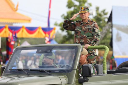 훈마넷 캄보디아 총리가 14일 캄퐁치낭주 왕립 헌병 훈련센터에서 병사들을 사열하고 있다. 캄퐁치낭=AP 연합뉴스 |