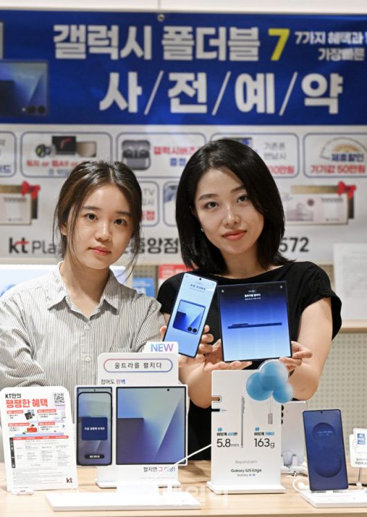 [이데일리 방인권 기자] KT가 삼성전자 '갤럭시 Z 폴드7'과 '갤럭시 Z 플립7' 사전 예약을 시작한 15일 서울 종로구 KT플라자 광화문중앙점에서 사전 예약 혜택을 소개하고 있다. KT는 폴드7·플립7 구매 고객을 대상으로 구입 2년 후 기기 반납 및 변경 시 보상 혜택('안심체인지 플러스' 기준 출고가의 최대 50%)을 개통 시점에 할인해주는 '미리보상 프로그램'과 각종 혜택을 마련했다.