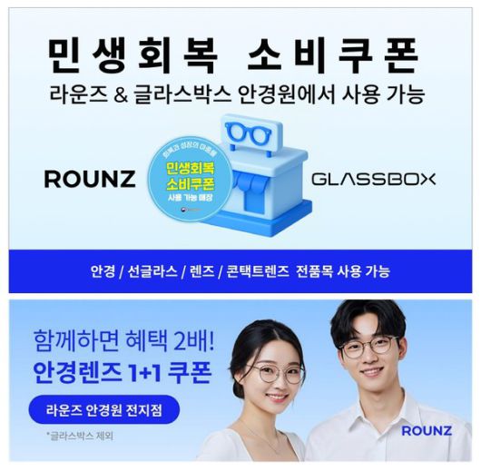 라운즈 관계자는 "소비쿠폰 사용과 안경렌즈 1+1 이벤트를 연계해 소비자들이 더 크게 체감할 수 있는 혜택을 드리고자 기획했다"면서 "이번 기회를 통해 미뤄뒀던 시력 점검과 안경 교체를 부담 없이 해결하고, 가족과 함께 합리적인 쇼핑을 경험하시길 바란다"고 전했다.