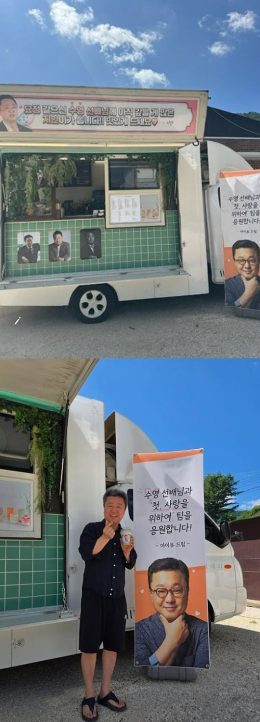 공개된 사진에는 아이유에게서 커피차 선물을 받은 박수영이 환한 표정으로 인증샷을 촬영한 모습이 담겨 있다.