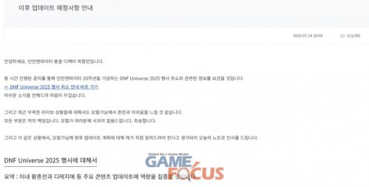 한편, 단일 IP로는 가장 큰 규모로 준비중이었던 DNF Universe 2025의 행사 취소 소식을 접한 게이머들은 가장 큰 원인이 되었을 것으로 추정되는 네오플 노조의 파업에 대해 부정적인 의견을 드러내고 있다. 여기에 최근 업데이트 됐거나 준비중인 콘텐츠 품질에 대한 부정적인 평가가 이어지면서 “유저들을 불모로 잡지 말라”는 의견과 함께 게임 서비스 정상화에 대한 다양한 의견을 보이고 있다.