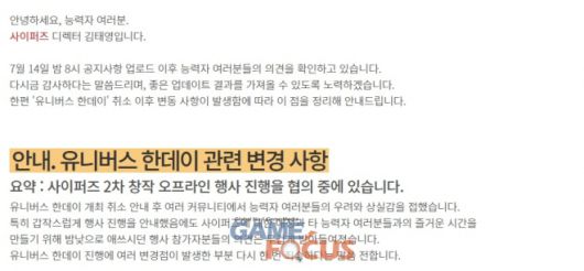 김태형 디렉터는 “유니버스 한데이 개최 취소 안내 후 여러 커뮤니티에서 능력자 여러분들의 우려와 상실감의 메시지를 접했다. 특히 갑작스럽게 행사 진행을 안내했음에도 사이퍼즈에 대한 애정과 타 능력자 여러분들과의 즐거운 시간을 만들기 위해 밤낮으로 애쓰시던 행사 참가자분들의 의견을 무겁게 받아들이고 있다”며 “유니버스 한데이 진행에 여러 변경점이 발생한 부분 다시 한 번 죄송하다는 말씀 드린다”라고 말했다.