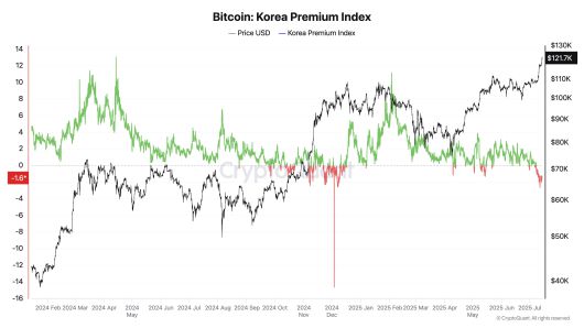 15일 블록체인 데이터 분석 업체 크립토퀀트에 따르면 전날 국내 주요 거래소에서 형성된 비트코인 가격은 해외 평균 시세보다 1.6% 가까이 낮은 것으로 나타났다. 실제로 전날 오후 1시 기준 비트코인은 바이낸스 등 해외 거래소에서 12만900달러(약 1억6687만원)를 기록했으나 같은 시각 국내 거래소 업비트에서는 200만원 이상 저렴한 1억6417만원에 거래됐다.