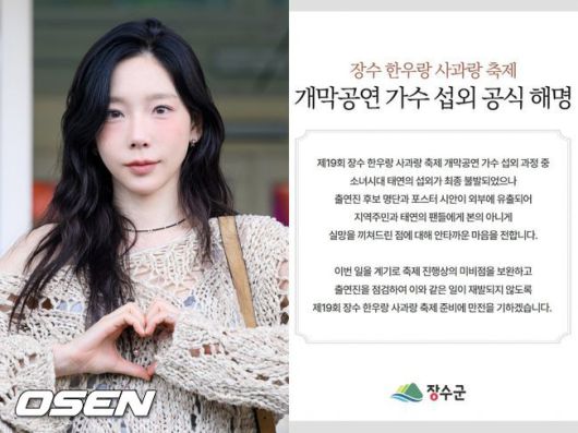 15일 장수군청은 공식 SNS를 통해 “제19회 장수 한우랑 사과랑 축제 개막공연 가수 섭외 과정 중 소녀시대 태연의 섭외가 최종 불발되었으나 출연진 후보 명단과 포스터 시안이 외부에 유출돼 지역주민과 태연의 팬들에게 본의 아니게 실망을 끼쳐드린 점에 대해 안타까운 마음을 전한다”고 밝혔다.