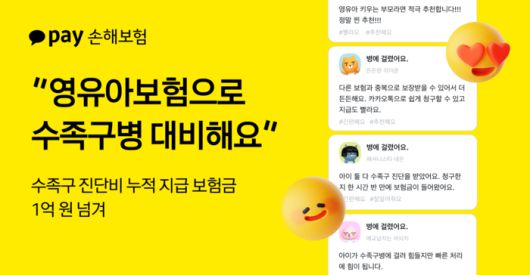 카카오페이손해보험은 영유아보험 가입자 중 수족구 진단비로 돌려받은 누적 보험금이 출시 1년 만에 1억원을 넘어섰다고 15일 밝혔다.