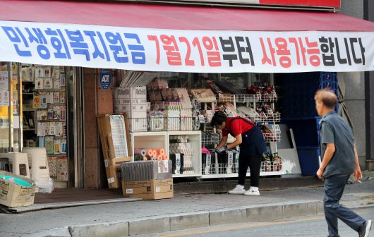 14일 대전 서구 갈마동의 한 생활용품 매장에 민생회복 지원금 사용 안내문이 걸려 있다. /신현종 기자 |