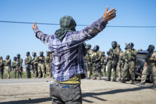 지난 10일 미국 캘리포니아주의 한 농업 지역에서 연방 이민국 요원들과 시위대가 대치하고 있다. AP연합뉴스 |