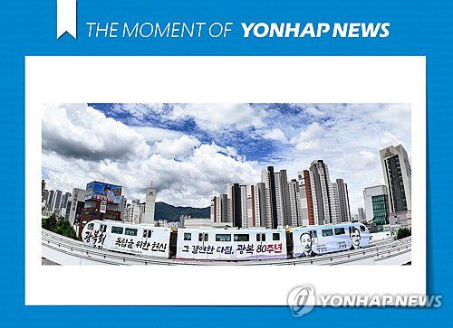 (대구=연합뉴스) 윤관식 기자 = 광복절을 한 달 앞둔 15일 대구 수성구 도심에서 대구도시철도3호선 보훈 테마열차가 이동하고 있다.