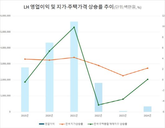 이에 따라 LH의 영업이익은 집값, 땅값 흐름에 연동됐다. 알리오에 따르면 집값 급등기였던 2020년과 2021년 LH 영업이익은 전년 대비 각각 55.8%, 30.3% 급증했지만 2022년, 2023년 집값 상승세가 둔화하고 하락 전환하자 LH 영업이익은 전년 대비 67.9%, 97.6% 감소했다.