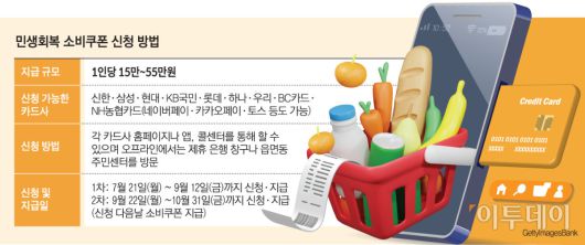 민생회복 소비쿠폰은 이달 21일 오전 9시부터 온·오프라인으로 신청이 가능하다. 신용·체크카드, 선불카드, 지역사랑상품권 중 원하는 방식을 선택할 수 있다. 1차로 15만~45만 원 상당의 소비쿠폰을 소득별로 차등 지급하고, 2차로는 국민 90%를 대상으로 10만 원을 추가 지급한다.