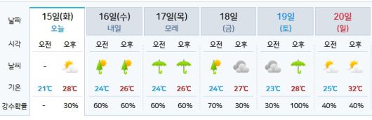 15일 화요일은 오전 흐림, 오후에는 구름이 많은 날씨를 보이며, 기온은 21도에서 28도 사이를 기록했다. 수요일부터 금요일까지는 비 소식이 이어진다. 수요일과 목요일은 오전과 오후 모두 강수 확률 60%로 가끔 비 또는 비가 지속될 것으로 예보됐다.