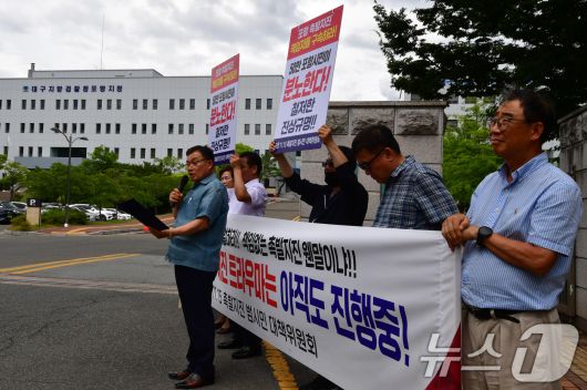 (포항=뉴스1) 최창호 기자 = 경북 포항 11·15촉발지진 범시민대책위원회(위원장 강창호) 회원들이 15일 오후 대구지방법원 포항지원 앞에서 지난 2017년 11월 15일 발생한 포항촉발지진 원인 제공자들 구속 촉구 기자회견을 하고 있다. 2025.7.15/뉴스1