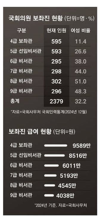 15일 국회 사무처에 따르면 300명의 의원은 의원실마다 총 8명의 보좌진을 둘 수 있다. 4급 보좌관과 5급 선임비서관을 2명씩, 6~9급 비서관은 1명씩 둘 수 있다. 여기에 추가로 인턴 비서관과 무급 형태의 입법보조원도 둘 수 있다. 4급 보좌관 급여는 연봉 9000만원대로, 기업과 비교해서 나쁘다고 볼 수 없다.