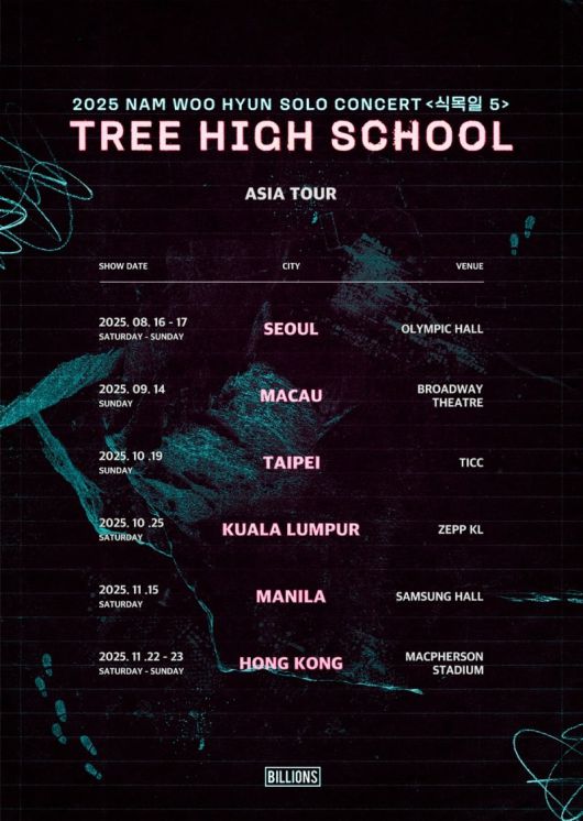 소속사 빌리언스는 15일 0시 공식 SNS를 통해 '2025 남우현 솔로 콘서트 '식목일5 - 나무고(高) :트리 하이스쿨'(2024 NAM WOO HYUN SOLO CONCERT '식목일5 - 나무고(高) :TREE HIGH SCHOOL')'(이하 '식목일5') 아시아 투어 포스터를 공개했다.