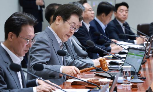 의사봉 두드리는 李 이재명 대통령이 15일 서울 용산 대통령실 청사에서 열린 국무회의에서 의사봉을 두드리며 개회를 선언하고 있다. 대통령실사진기자단 |