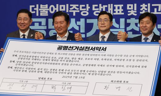 정·박 후보는 이날 국회에서 열린 공명선거실천서약식에 나란히 참석했다. 민주당은 19일 충청권을 시작으로 20일 영남권, 26일 호남권, 27일 경기·인천을 거쳐 8월 2일 서울·강원·제주 경선을 진행한 뒤 신임 당대표와 최고위원을 최종 선출한다.