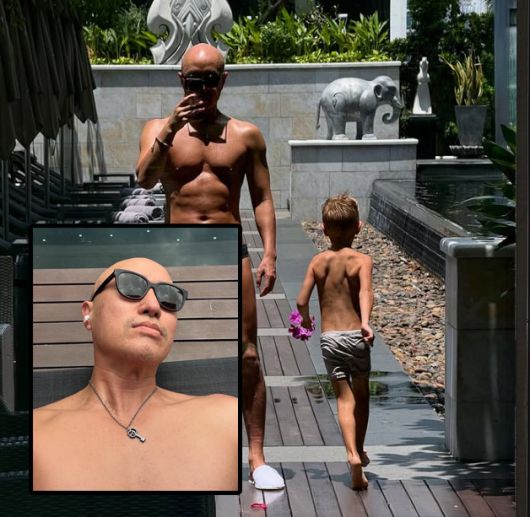 공개된 사진에는 태국 방콕을 찾은 홍석천 모습이 담겼다. 호텔 야외 수영장 거울에 비친 자신 모습을 카메라에 담는 과정에서 어린아이가 자신의 옆을 달리며 지나가자 그 순간을 포착한 듯하다.