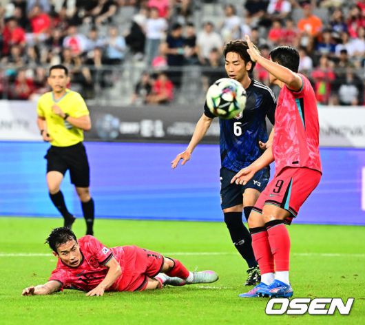 전반 한국 김문환이 문전에서 일본 수비수에 걸려 넘어지며 파울을 주장하고 있다. 2025.07.15 / jpnews@osen.co.kr