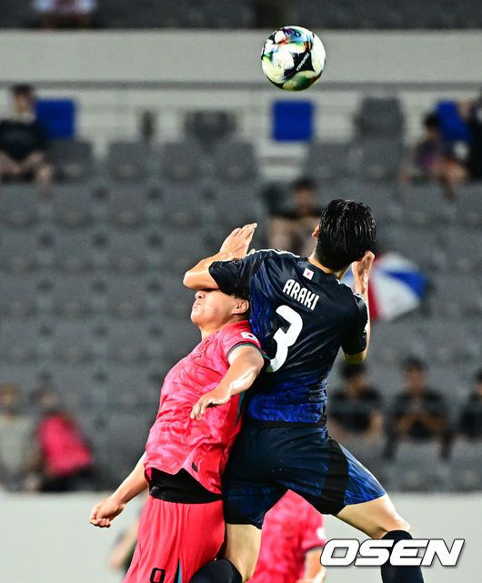 전반 한국 주민규가 일본 아라키에 파울을 당하고 있다. 2025.07.15 / jpnews@osen.co.kr