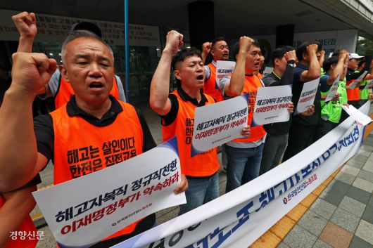 한국발전산업노동조합 조합원들이 15일 서울 중구 서울지방고용노동청 앞에서 해고자 복직을 촉구하는 구호를 외치고 있다.정효진 기자 hoho@kyunghyang.com▶ 매일 라이브 경향티비, 재밌고 효과빠른 시사 소화제!▶ 주 3일 10분 뉴스 완전 정복! 내 메일함에 점선면 구독©경향신문(www.khan.co.kr), 무단전재 및 재배포 금지