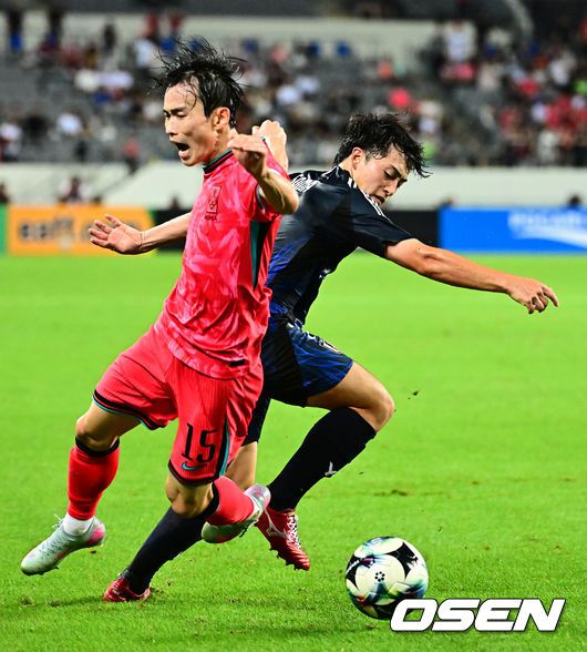 전반 한국 김문환이 일본 소마에 밀려 넘어지고 있다. 2025.07.15 / jpnews@osen.co.kr