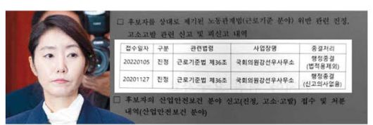 조은희 국민의힘 의원이 공개한 강선우 여성가족부 장관 후보자(왼쪽)에 대한 진정서. |