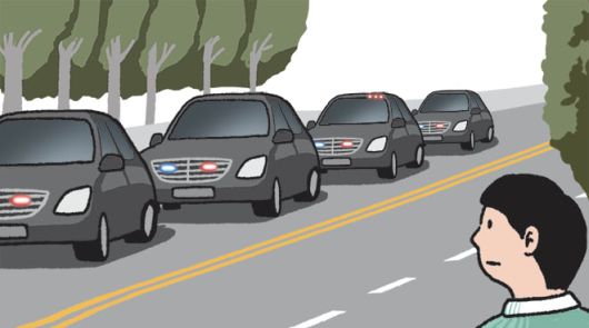 ▶일부 국가에서는 대통령급 최상위 요인 경호를 위해 수시간 전부터 도로를 통제하기도 한다. 대통령뿐 아니라 대통령 해외 순방에 동행하는 수행원, 기자단을 위해 도로 통제를 하는 국가도 여럿 봤다. 동선 내내 도로 옆 인도에 손을 흔드는 환영 인파까지 배치하기도 했다. 돈만 내면 공인이 아닌 사인을 위해 교통 통제를 해주는 나라도 있다. 경찰 모터사이클이 차량 옆에 붙어 목적지까지 막힘없이 인도한다고 한다.