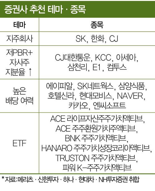 조수홍 NH투자증권 리서치센터장은 “지주 업종 내 상대적으로 PBR이 낮은 중소형 지주사가 상승 여력이 큰 편”이라며 “이미 PBR 1배 이상인 종목은 옥석 가리기가 필요하다”고 말했다. 이어 “향후 배당 분리과세 등 세법 개정을 예상하면 배당 지급 여력이 높은 증권 업종을 추천한다”고 덧붙였다.