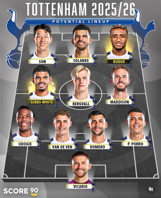 우리가 중점적으로 봐야할 부분은 바로 토트넘 훗스퍼다. 놀랍게도 손흥민이 당당히 이름을 올렸다. 공격진에 손흥민, 도미닉 솔란케, 모하메드 쿠두스가 구축했다. 중원은 모건 깁스-화이트, 루카스 베리발, 제임스 매디슨이 형성했다. 포백은 데스티니 우도기, 미키 판 더 펜, 크리스티안 로메로, 페드로 포로가 위치했다. 골문은 굴리엘모 비카리오가 지켰다.