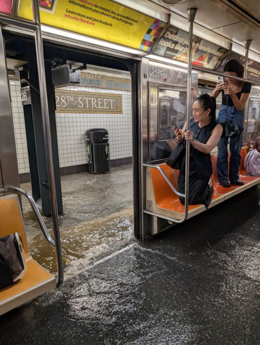 15일(현지 시간) 미국 뉴욕 맨해튼의 28번가 지하철역에서 폭우로 인해 지하철 안까지 물이 흘러 넘치고 있다. 뉴욕시는 전날 오후 7~8시 시간당 5cm가 넘는 비가 쏟아져 역대 두 번째로 많은 시간당 강수량을 기록했다고 밝혔다.사진 출처 Juan Luis Landaeta의 X 캡처 |