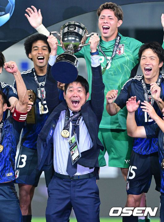 [OSEN=용인, 최규한 기자] 한국축구가 일본에 사상 첫 3연패를 당했다.홍명보 감독이 이끄는 남자축구대표팀은 15일 오후 용인 미르스타디움에서 열린 2025 동아시아축구연맹(EAFF) E-1 챔피언십(동아시안컵) 3차전에서 숙적 일본에게 0-1로 패해 우승컵 탈환에 실패했다.우승을 거머쥔 일본 모리야스 하지메 감독이 트로피를 들어올리며 환호하고 있다. 2025.07.15 / dreamer@osen.co.kr