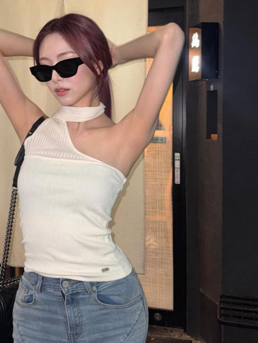 사진 속 유나는 붉은빛 퍼플 헤어에 또렷한 턱선과 군살 없는 어깨 라인이 돋보이는 화이트 백리스 탑을 매치해 바디라인을 극대화 했다. 특히 넥라인을 감싸는 꼬임 스트랩 디테일은 유니크함과 세련미를 동시에 부여하며 시선을 끈다.