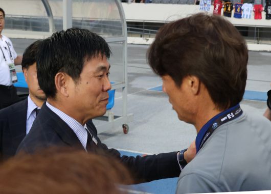 동아시안컵 한일전을 앞두고 인사를 나눈 모리야스(왼쪽) 일본 감독과 홍명보 한국 감독. [뉴스1] |