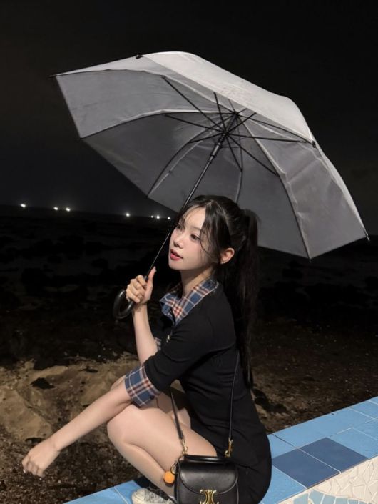 비 오는 밤 바깥 풍경을 배경으로 앉아 우산을 든 채 카메라를 응시하며, 그녀의 고운 이목구비가 돋보였다. 그윽한 눈빛과 여리여리한 얼굴 선이 조화를 이루며, 자연스러운 아름다움을 뽐냈다.