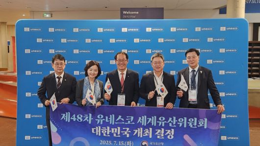 2026년 제 48차 유네스코 세계유산위원회의 한국 유치를 확정한 후 함께 포즈를 취한 최응천 국가유산청장, 박상미 주유네스코대한민국대표부 대사, 이준승 부산시 행정부시장, 박정하 국회의원, 조계원 국회의원(왼쪽부터). 사진 국가유산청 |