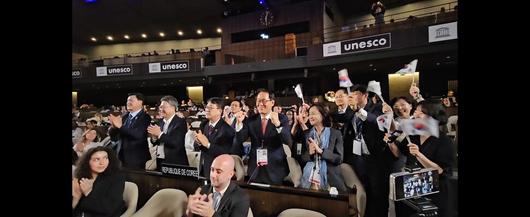 이준승 부산시 행정부시장 등이 프랑스 파리에서 열린 47차 유네스코 세계유산위원회에서 부산이 내년 48차 유네스코 세계유산위원회 개최 도시로 선정됐다고 발표하자 환호하고 있다. 부산시 제공 |