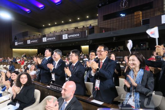 (서울=뉴스1) = 최응천 국가유산청장과 정부대표단, 부산시 관계자 등이 16일(한국시간) 프랑스 파리 유네스코 본부에서 열린 제47차 유네스코 세계유산위원회에서 차기 세계유산위원회 개최지로 대한민국 부산이 확정되자 손뼉을 치고 있다. (국가유산청 제공. 재판매 및 DB 금지) 2025.7.16/뉴스1