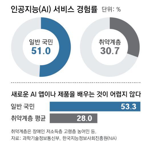 한국지능정보사회진흥원의 2024년 디지털 정보격차 통계에서도 AI 접근성 차이가 드러났다. ‘AI 서비스 경험이 있다’고 응답한 일반 국민은 51.0%였지만 저소득층, 장애인, 고령자 등 취약계층 평균은 30.7%로 20%포인트 이상 격차가 벌어졌다.