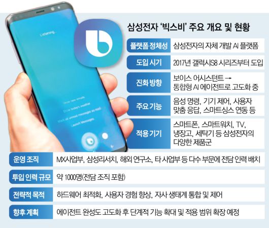 실제 삼성전자는 빅스비를 담당하는 전담조직을 MX사업부 내에 운영 중이며 삼성리서치 산하를 포함해 해외 연구소, 타 사업부까지 포함할 경우 약 1000명 규모의 인력이 관련 업무에 투입된 것으로 알려졌다.