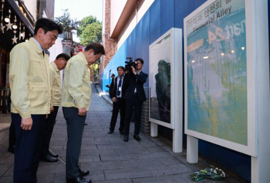 이재명 대통령이 지난달 12일 서울 용산구의 이태원 참사 현장 ‘10·29 기억과 안전의 길’을 방문해 묵념하고 있다.(사진=뉴시스) |