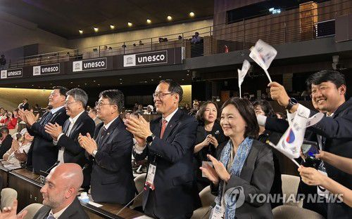 (파리=연합뉴스) 김예나 기자 = 15일(현지시간) 프랑스 파리 유네스코 본부에서 열린 제47차 유네스코 세계유산위원회에서 차기 위원회 개최지로 대한민국이 확정되자 최응천 국가유산청장(가운데)과 정부 대표단이 박수를 치고 있다. 2025.7.16
