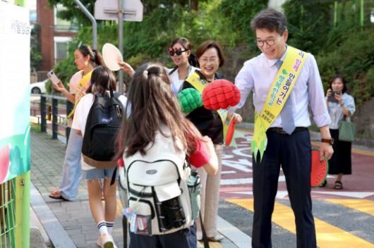 행당초등학교 앞에서 등교하는 학생과 인사를 나누고 있는 정원오 성동구청장. 성동구 제공. |