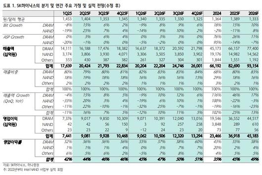 2분기 매출액은 20조4000억 원, 영업이익은 9조800억 원으로 전망했다. 기존에 가정했던 환율보다 30원 이상 하락하면서 영업이익에서 3000억 원 이상 하향 조정했다. 김 연구원은 “다만 기존에 추정했던 것보다 관세에 따른 선제적인 물량 증가가 일부 파악돼 비트 그로스(bit growth)는 디램(DRAM)을 기존 11%에서 15%로, 비휘발성메모리(NAND)를 20%에서 25%로 상향조정했다”고 밝혔다.