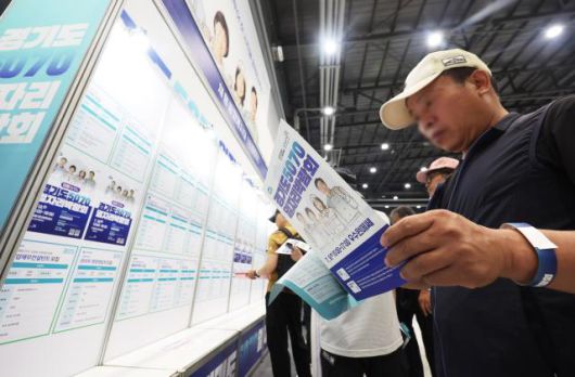 지난 9일 경기도 수원시 권선구 수원메쎄에서 열린 '경기도 5070 일자리 박람회'에서 구직자들이 채용정보 게시판을 살펴보고 있다. [사진=연합뉴스] |