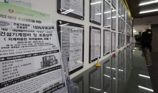 서울 마포구 서울서부고용복지플러스센터 일자리정보 게시판 앞에 건설기계정비학원 안내문이 놓여 있다. [연합] |