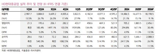 이에 이 연구원은 HD현대중공업의 2025년 매출액이 전년 대비 15.1% 증가한 16조 6775억원, 같은 기간 영업이익이 167.1% 늘어난 1조 8835억원을 기록하리라고 전망했다. 상선 부문에서 고가 선박의 매출 비중 상승에 따른 실적 개선 및 엔진 부문의 업황 호조가 지속되며 실적 성장세가 이어지리란 분석이다.